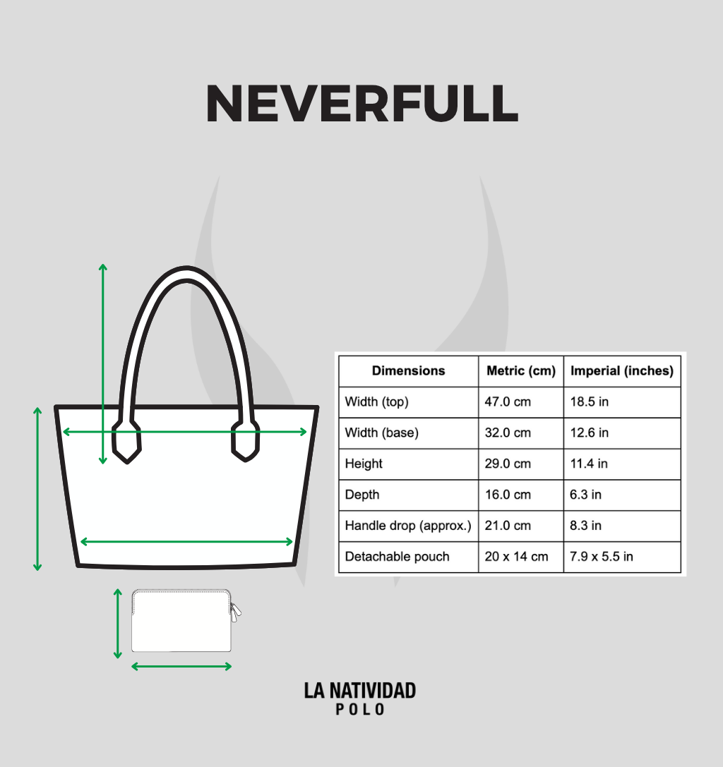 Un clásico de todos los días. Inspirado en siluetas icónicas como el Saint Louis de Goyard y el Neverfull de Louis Vuitton, este bolso tote lleva el monograma de La Natividad en verde oscuro y detalles en verde La Nati. Incluye pouch interior desmontable para más practicidad y estilo — ideal tanto en la ciudad como en el club.