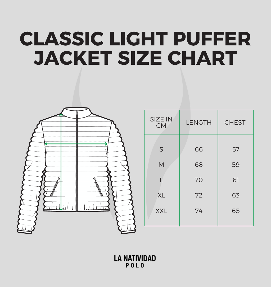 A lighter take on our classic puffer. This slim-fit jacket is filled with high-quality down for lightweight warmth and comfort. Finished in high-shine black with fully embroidered La Natividad logos on the chest and back. Inside, you’ll find our signature monogram lining, while custom La Nati zip pullers add subtle detail. Comes with its own travel pouch — ideal for packing light on polo days or trips.